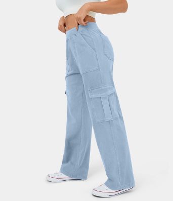 Jeans casuales anchos elásticos Halara Flex™ lavados de tiro alto con varios bolsillos y dobladillo enrollado