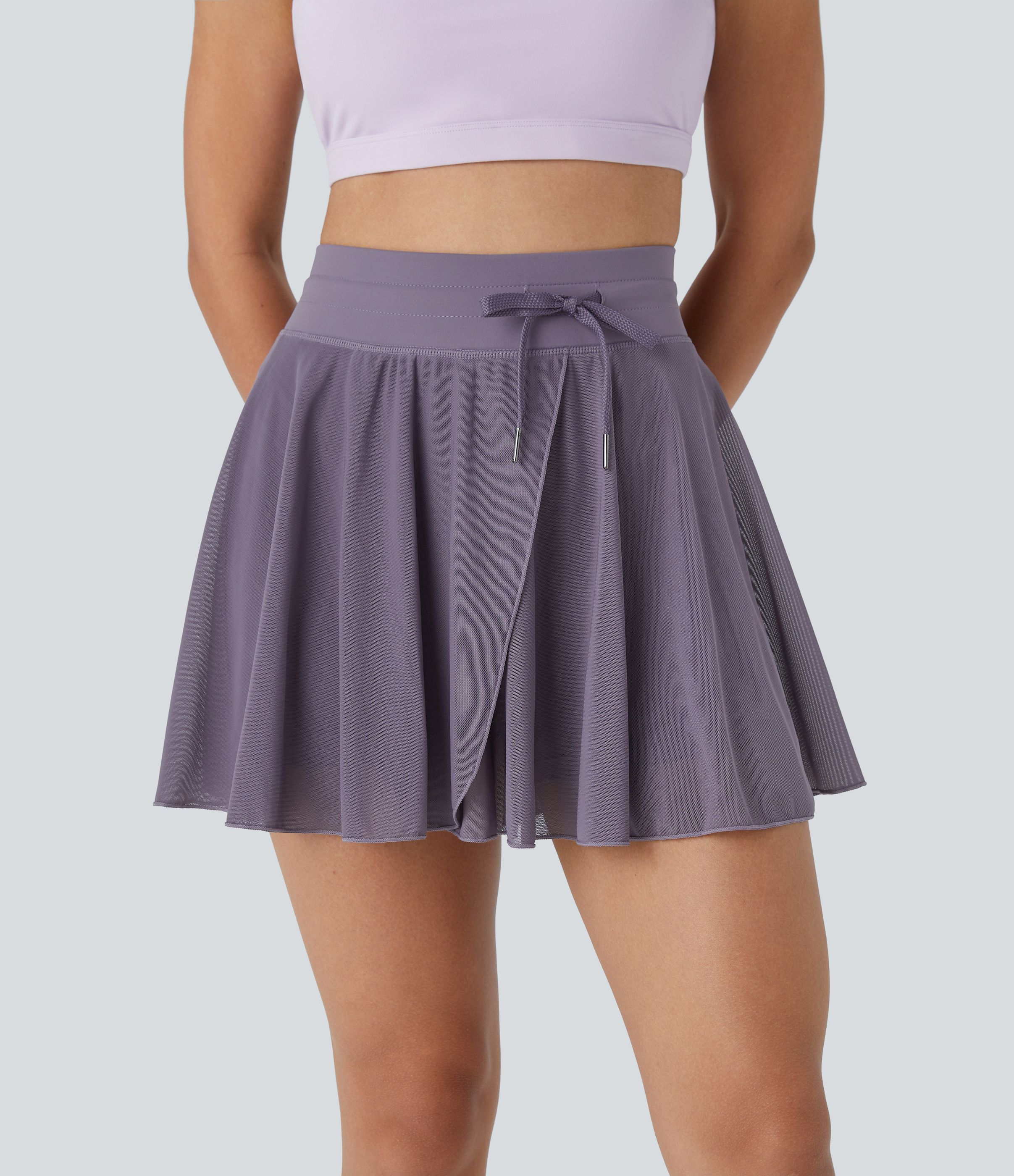 Falda mini acampanada fluida bolsillo lateral 2 en 1 malla contrastante cordón tiro alto