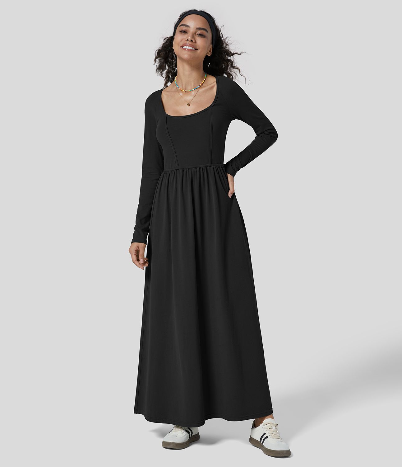 Vestido de algodón casual cuello en U sin espalda con lazos manga larga plisado longitud maxi
