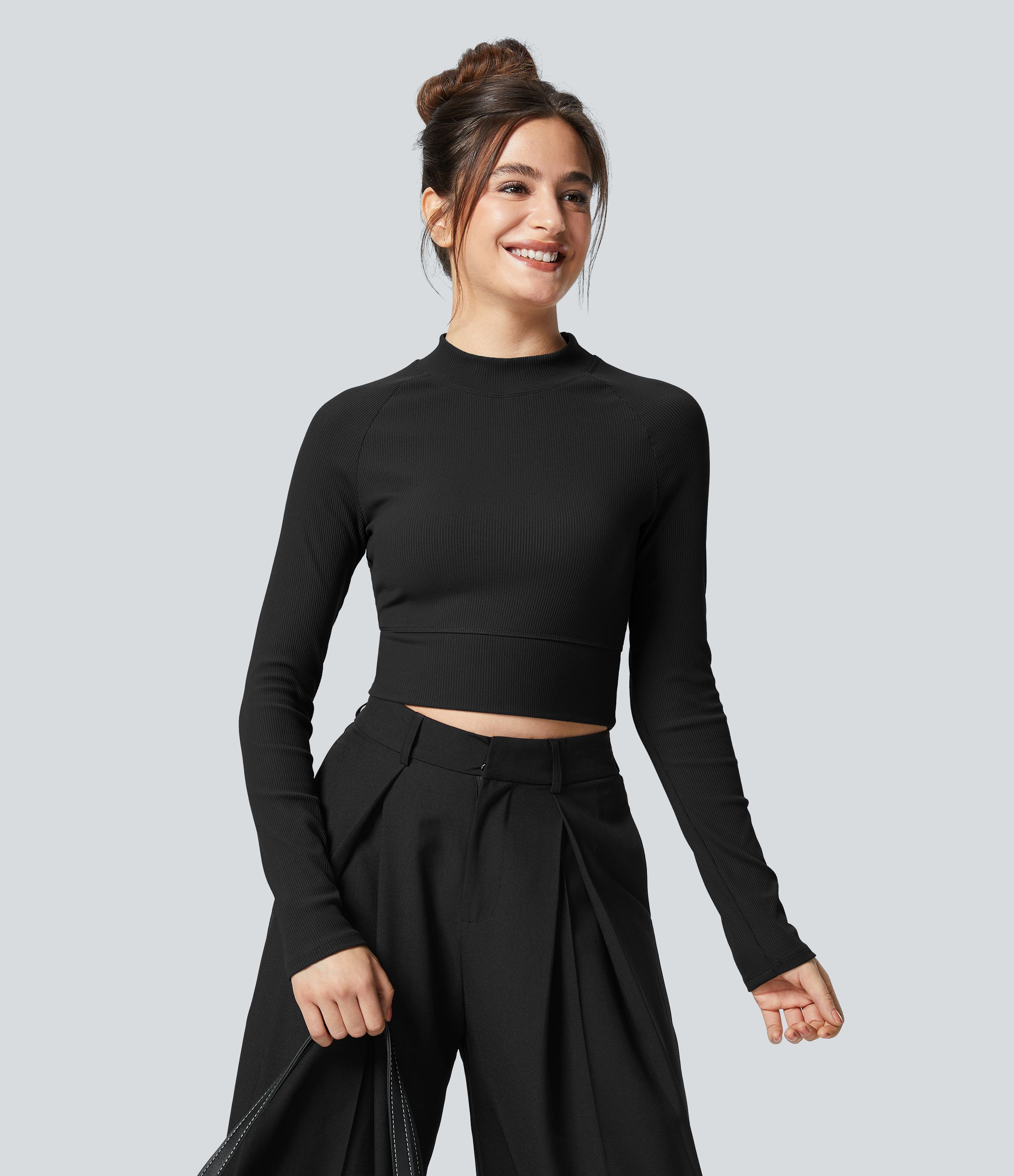 Top deportivo Softlyzero™ acanalado de manga larga con cuello perkins
