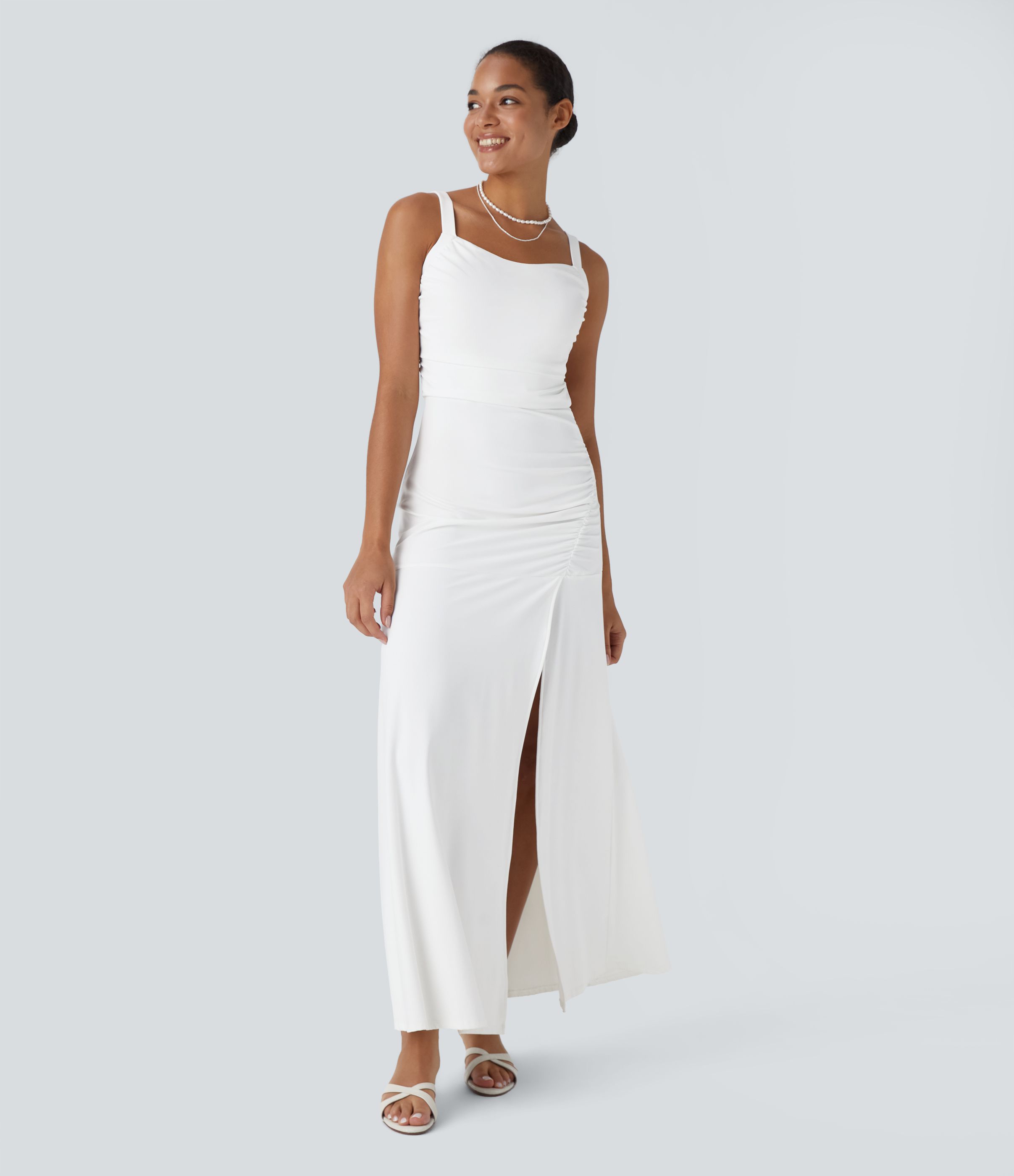 Vestido largo dama de honor invitada boda cuello cuadrado fruncido sin espalda entrecruzado cordón