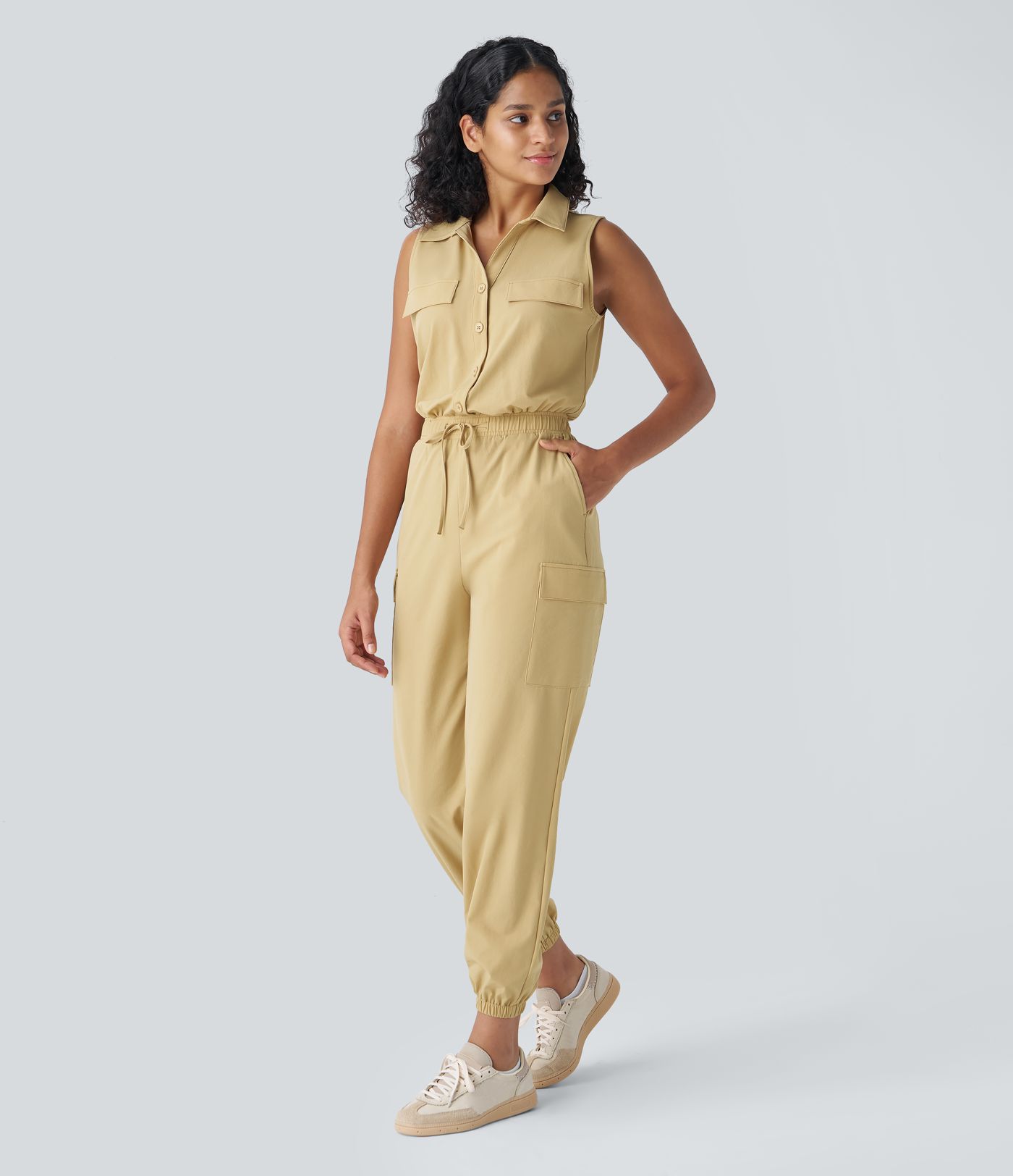 Mono jogger cargo cuello sin mangas botón cordón múltiple bolsillo