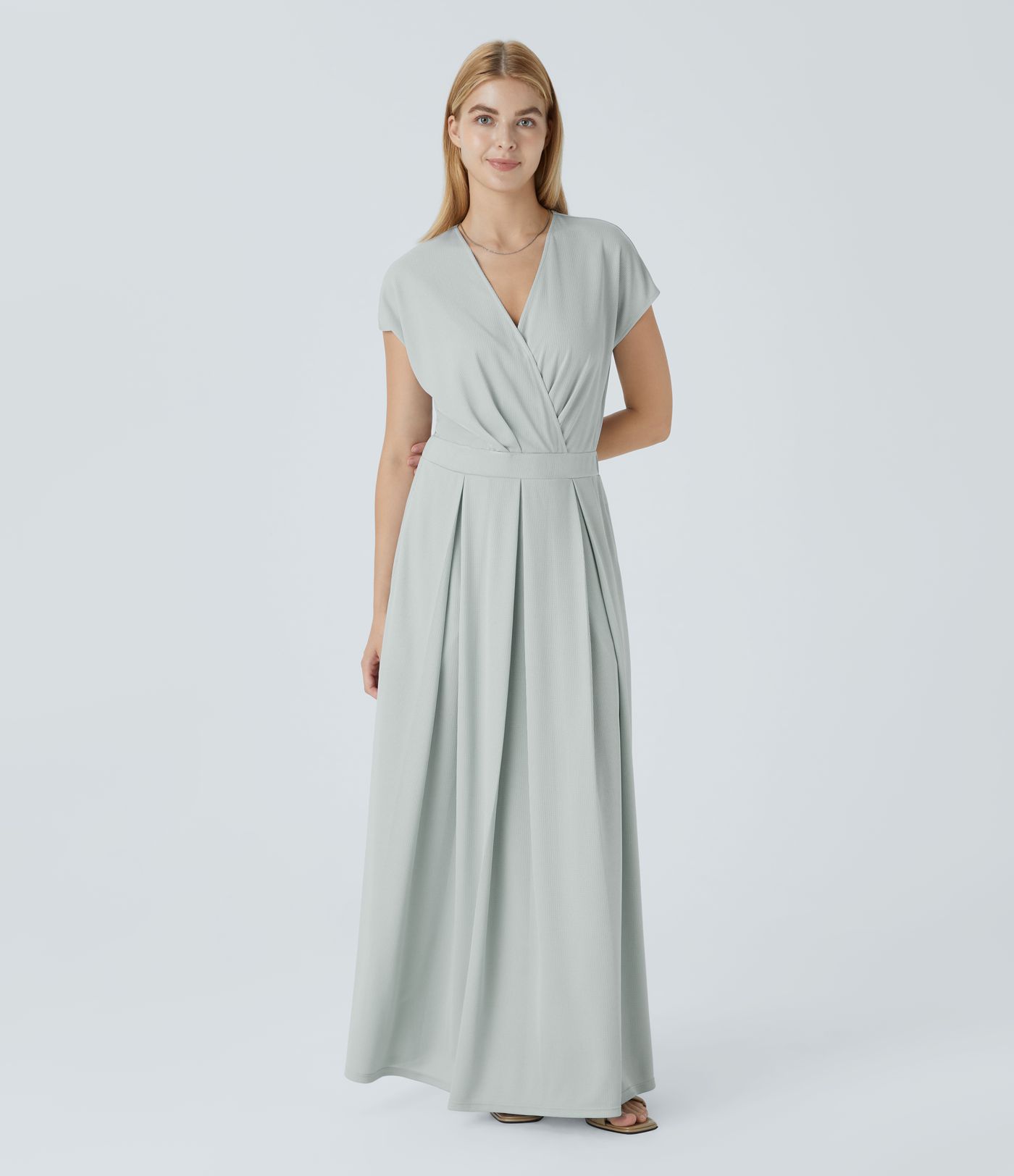 Vestido maxi cuello V manga corta bolsillo lateral plisado gofre fluido