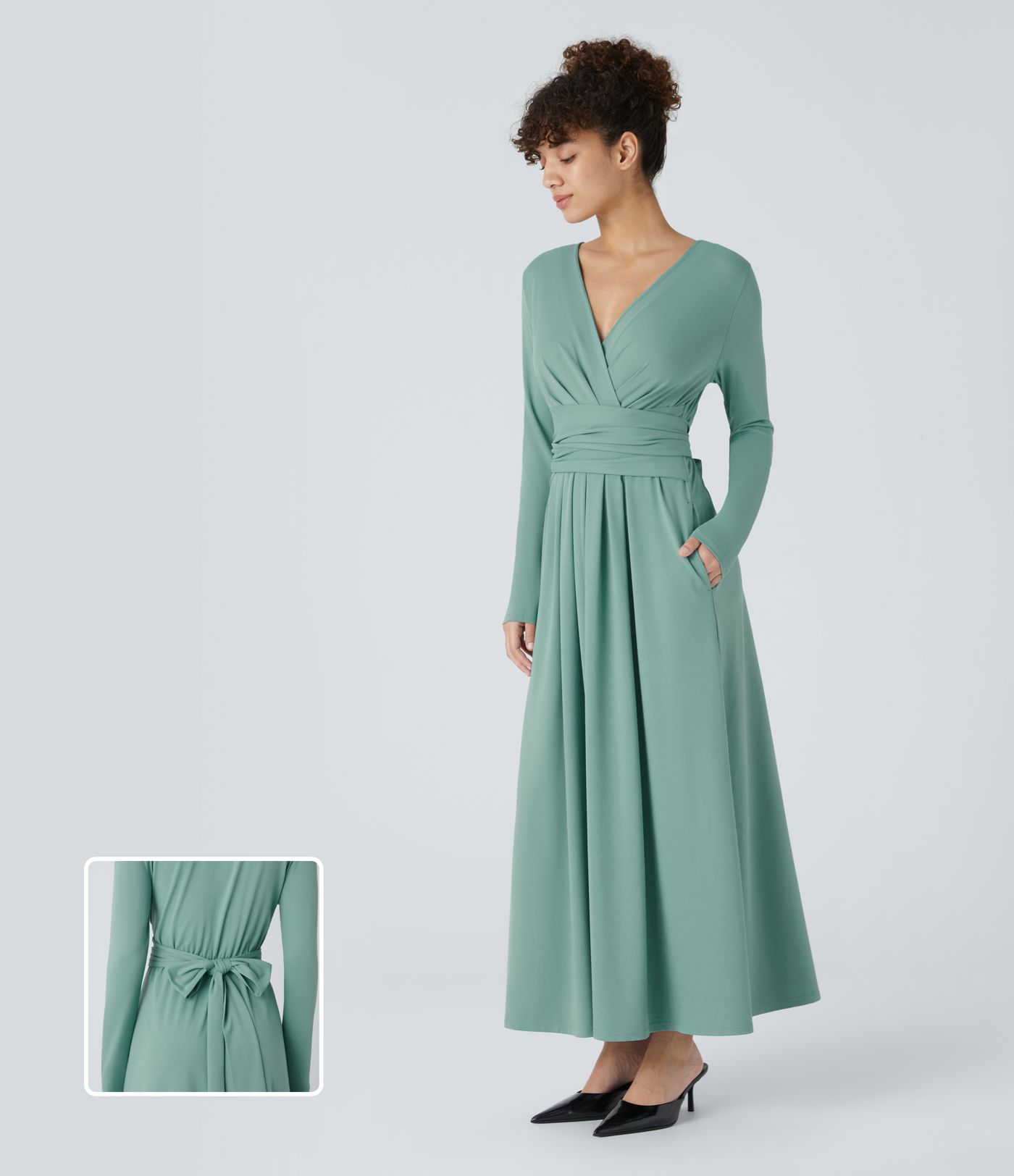 Vestido plisado cuello V manga larga bolsillo lateral lazo espalda