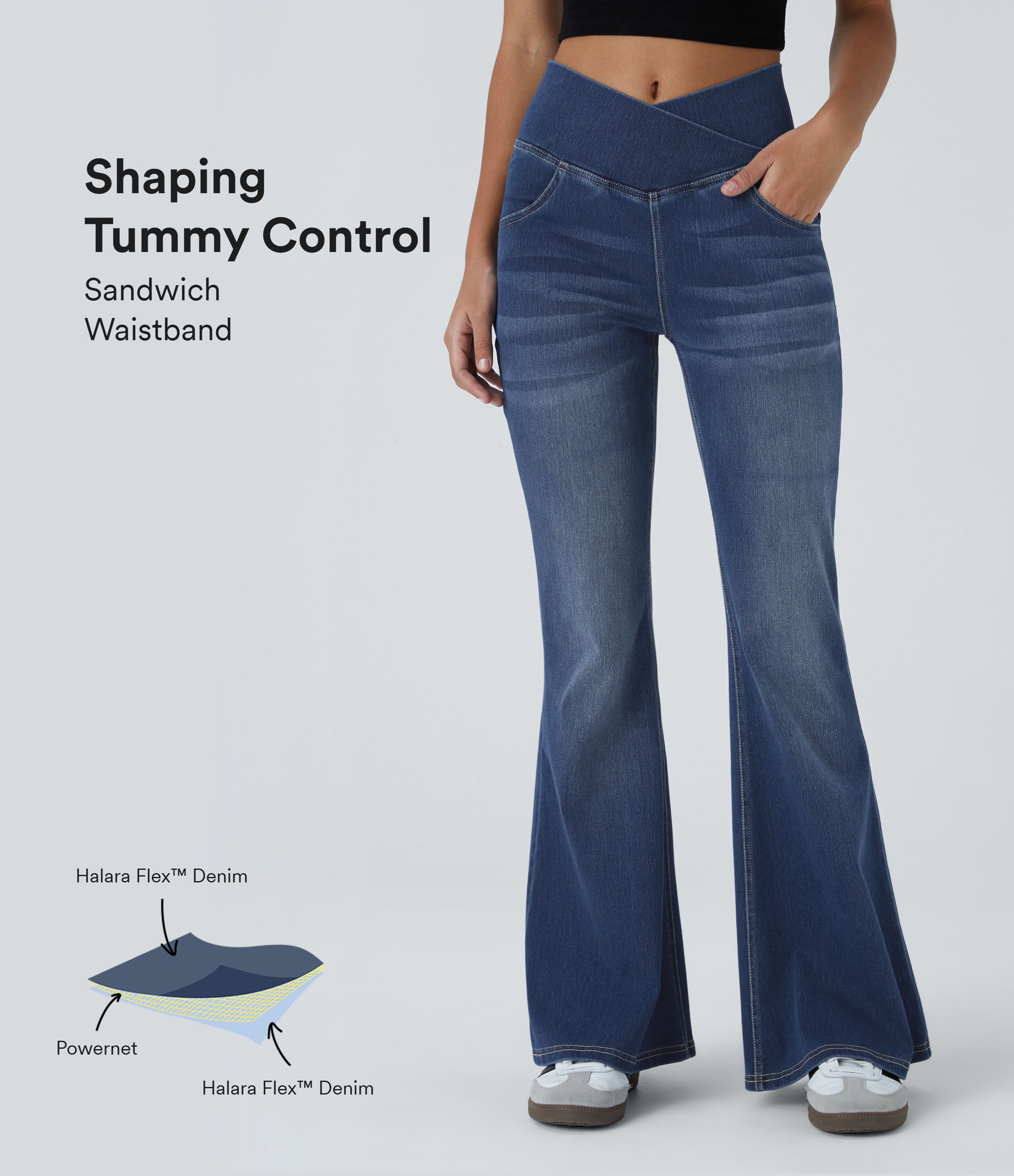 Halara Flex™ Vaqueros de tiro alto con cintura cruzada, con bolsillos, lavados, de corte relajado y pernera ancha