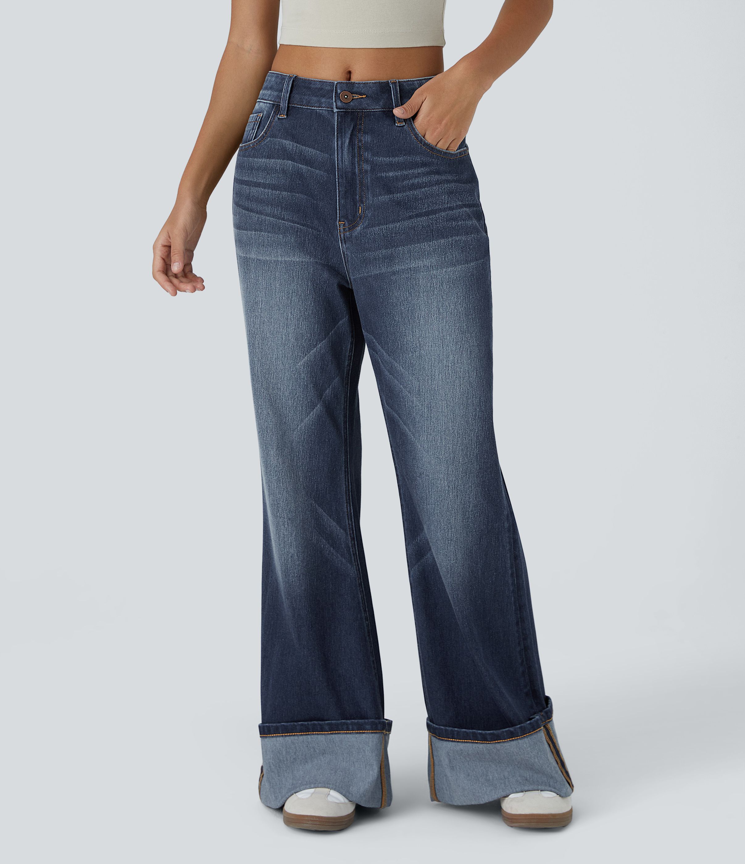 Jeans Baggy Halara Flex™ Denim tiro medio botón cremallera múltiple bolsillo elástico lavado holgado pierna ancha