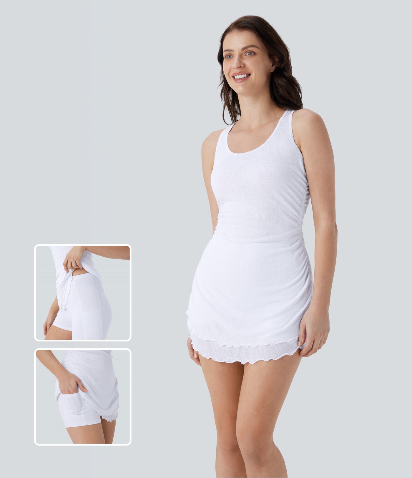 Vestido corto conjunto 2 piezas ajustado tirante fino fruncido espalda bolsillo lateral ribete forma lechuga