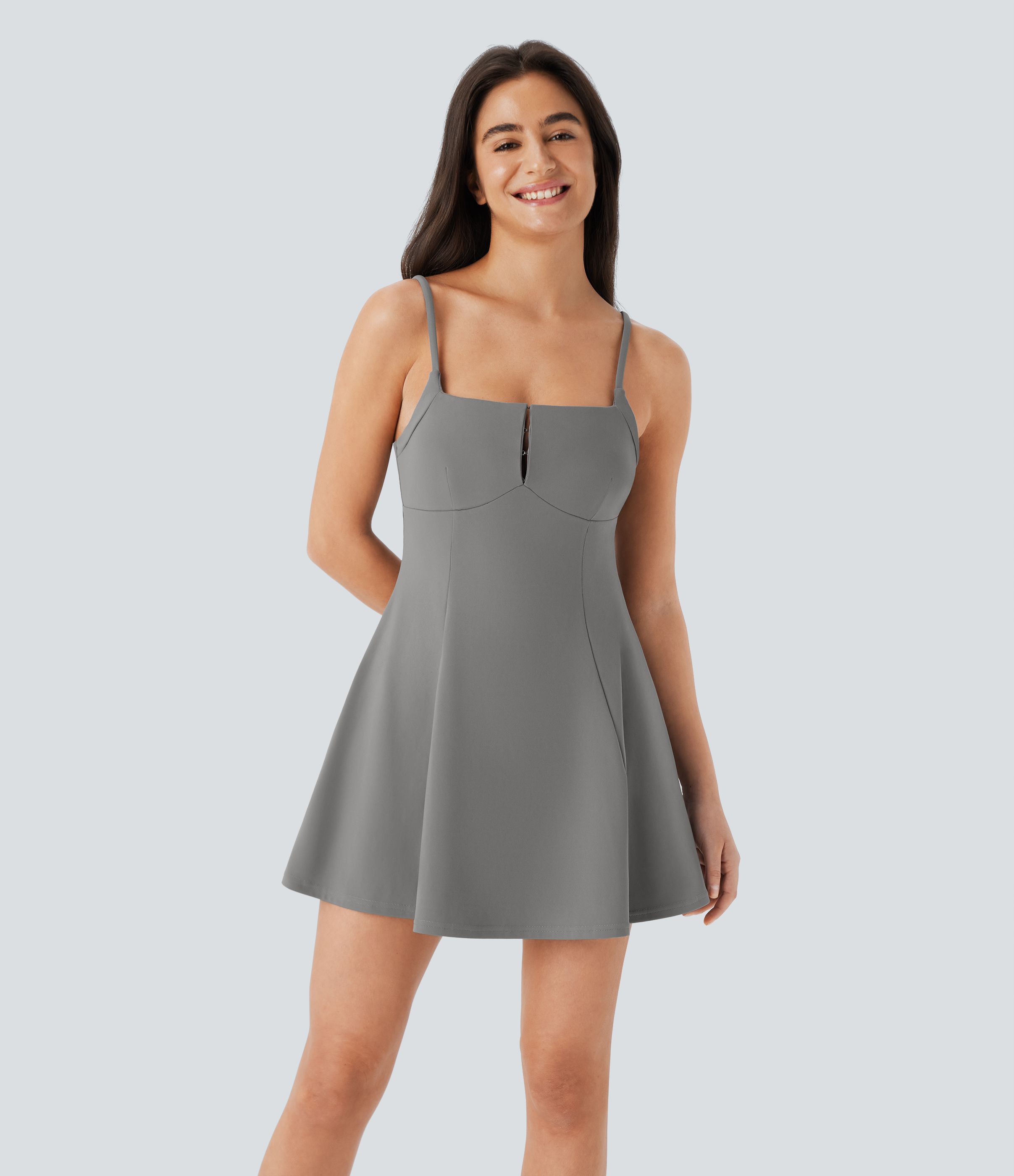 Mini Vestido 2 piezas bolsillo lateral cuello cuadrado correa ajustable gancho