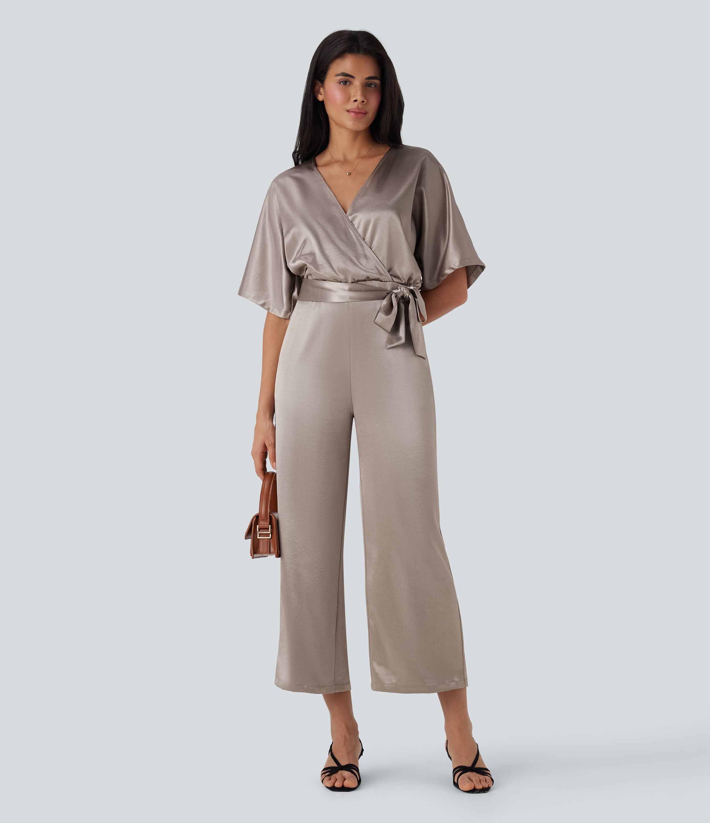Mono de oficina ancho con escote en V cruzado efecto satén, cremallera invisible y cinturón con bolsillos