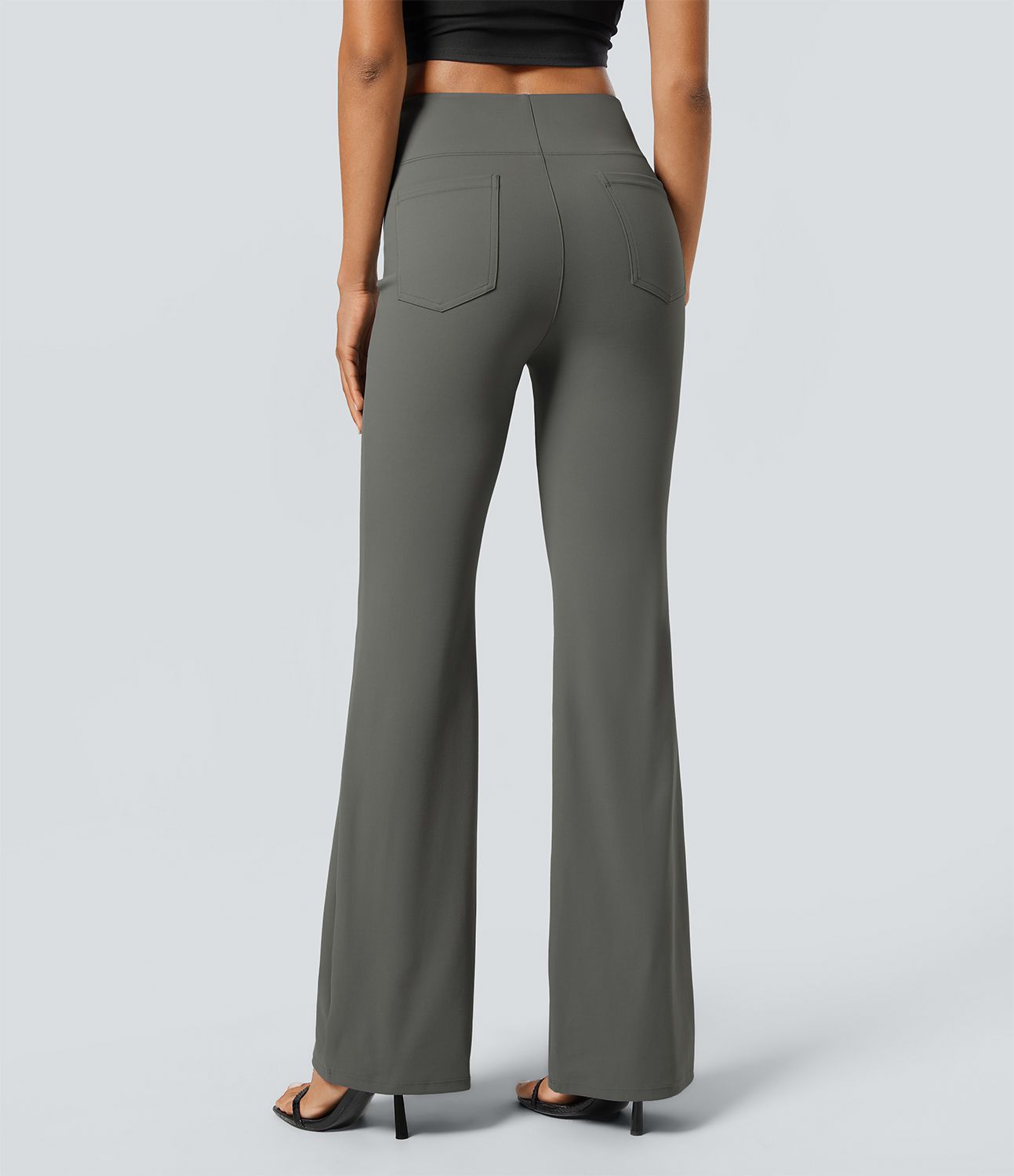 Pantalón oficina tiro alto bolsillo trasero lateral ligero acampanado