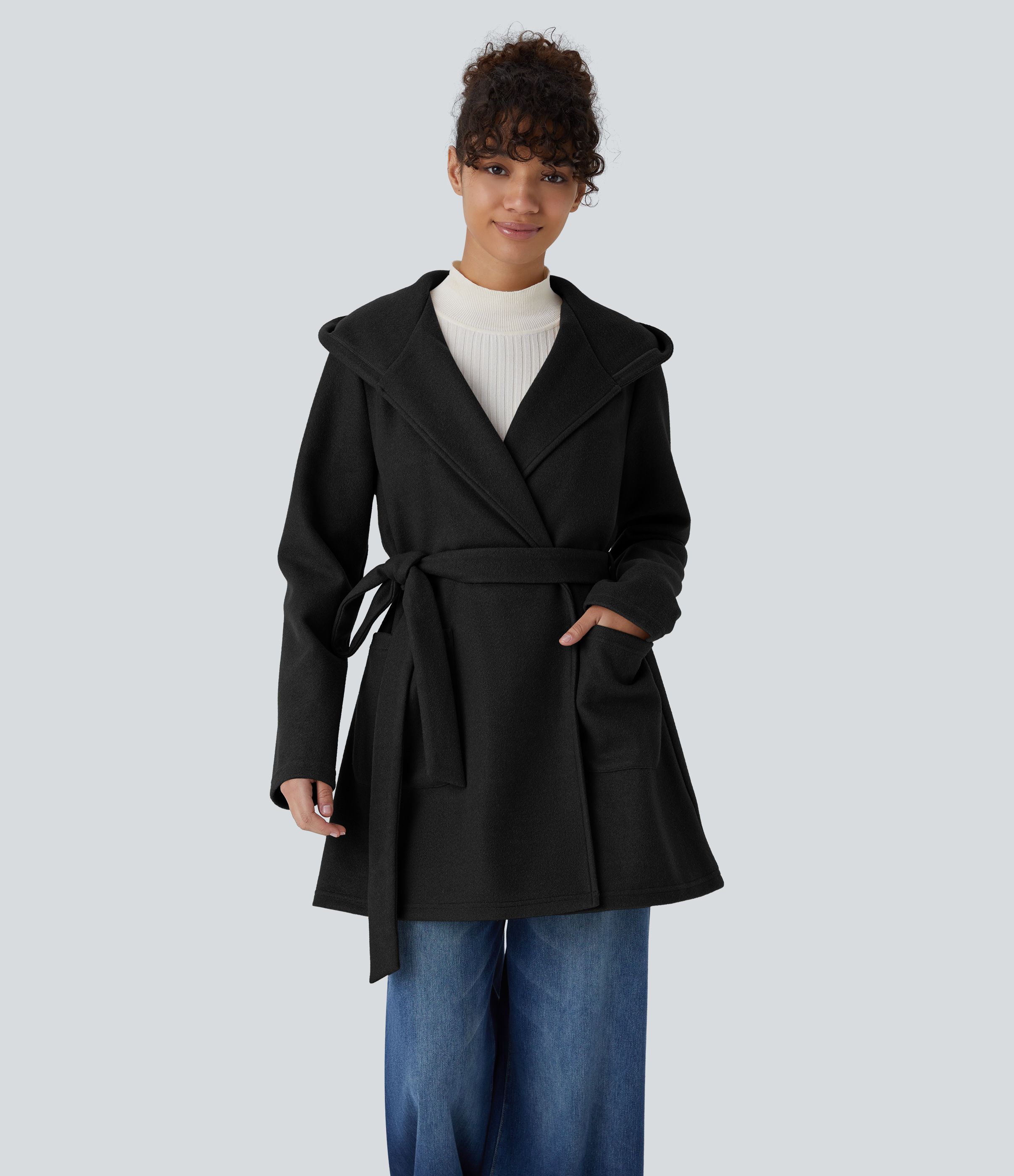 Abrigo holgado capucha manga larga botón bolsillo delantero cinturón