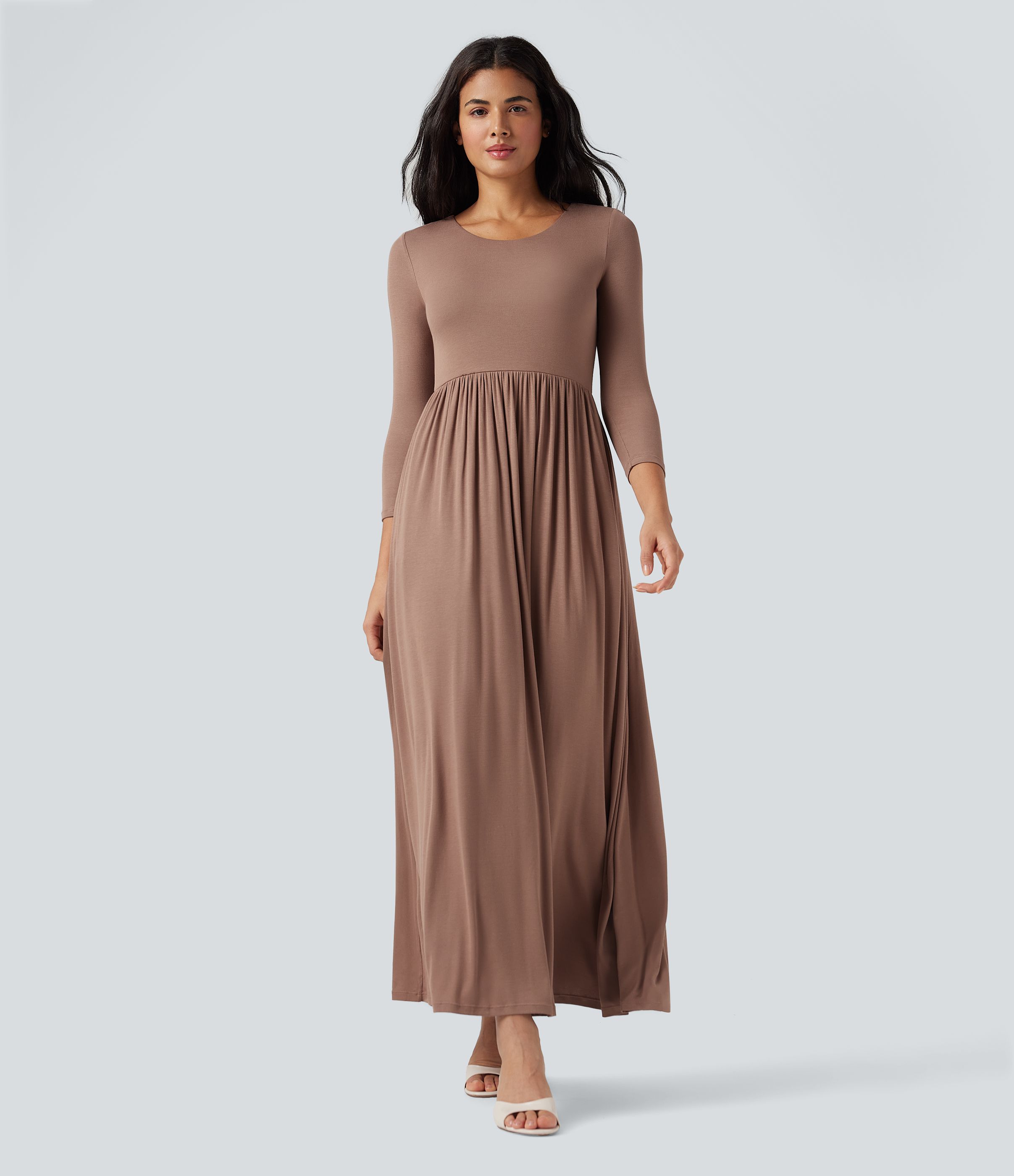 Vestido maxi casual fluido con cuello redondo acanalado y mangas 3/4 con bolsillos